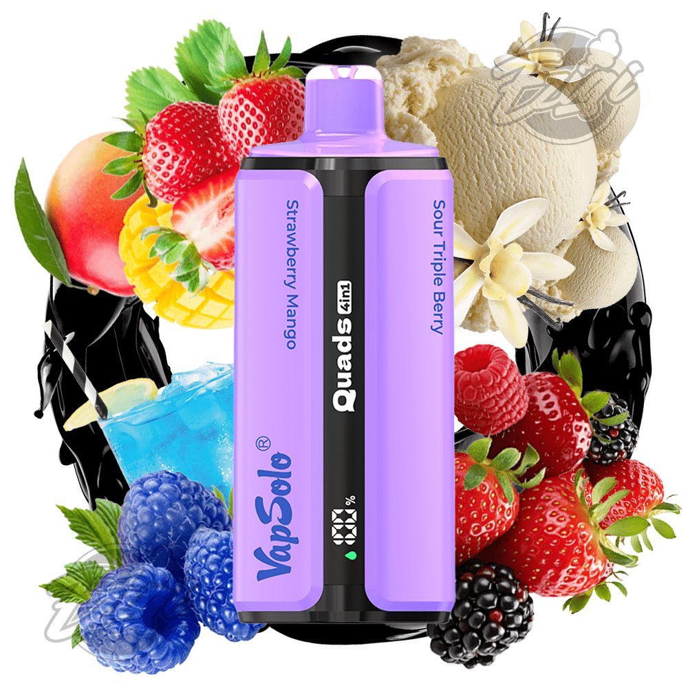 VAPSOLO QUADS – STRAWBERRY MANGO & BLUE RAZZ LEMONADE & VANILLA ICE CREAM & SOUR TRIPLE BERRY